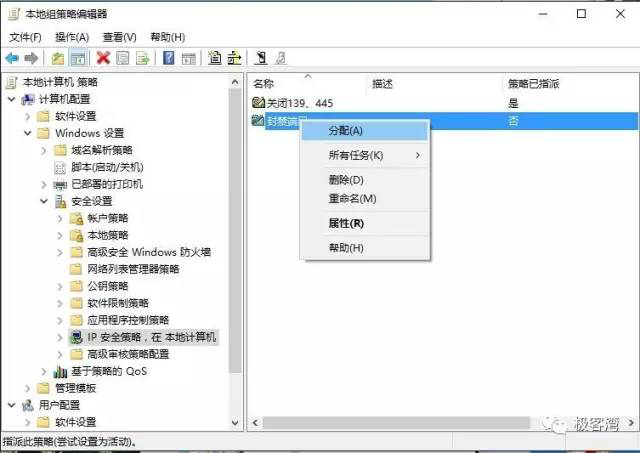 20、回到组策略编辑器,右键单击右侧刚才创建的“封禁端口”,在右键菜单当中选择分配,就成功关闭了445端口。