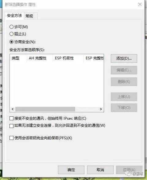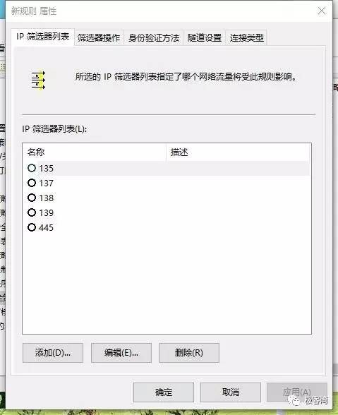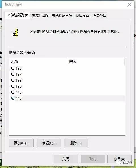 18、单击确定,回到新规则属性窗口中的筛选器操作,勾选刚才建立的“阻止”,在切换到IP筛选器列表,勾选刚才建立的“445”。然后单击应用,再单击关闭。