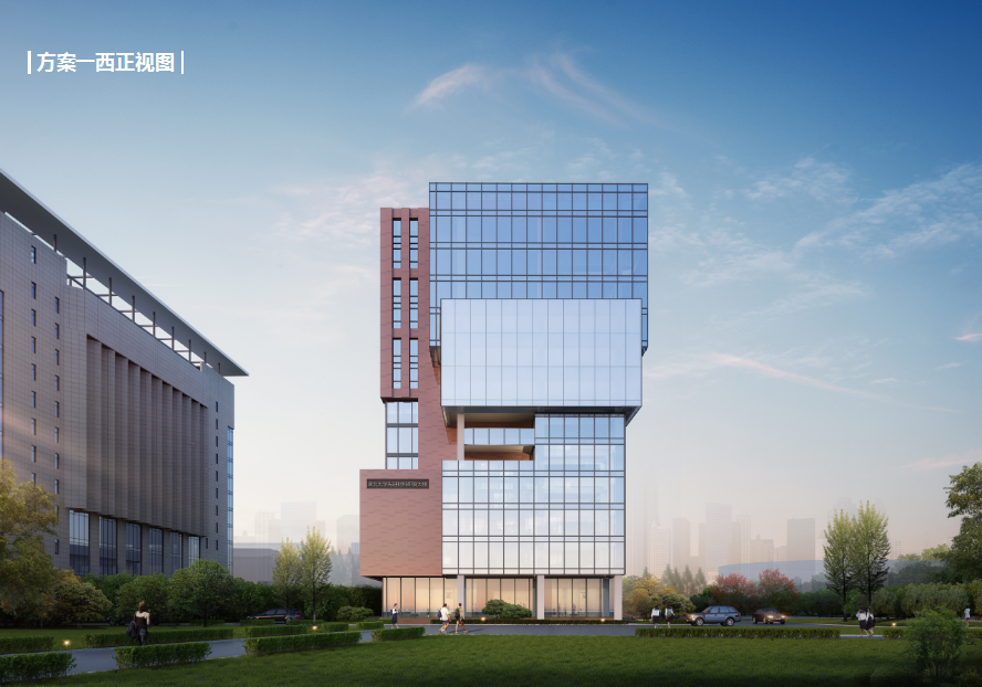 研发大楼包含科技研发企业研发办公与教育部重点实验室两大功能。在此基础上,设计以打造成尊重环境、彰显品质、校企融合的国家级孵化平台为目标,以服务创新创业、促进科技成果转化、优化创业环境、培育企业家精神为宗旨,以秉承产业推动科研,科研助推产业为原则,达到校企融合、共同发展的目的。建筑空间形态上,期望延续校企融合的理念,两大功能体块相互咬合呈一个整体,打造出相互融合又彼此独立的空间形体关系,同时最大化地减少交通面积,增加得房率,提高使用效率。建筑材质上,将学院与企业两大功能在立面材料上进行区分,学院立面延续学校历史色彩元素,采用赭石色陶板做装饰材料来彰显学院庄严沉稳的气质,企业立面则融合新材料理念,采用灰白双色玻璃幕墙来营造现代感和科技感。