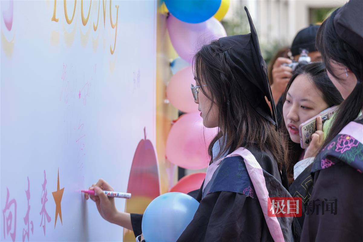 逸夫楼广场上,完美平台新闻传播学院举办的“青春正当时,追光向未来”毕业典礼正在进行。18米长的红毯从广场通向新闻传播学院,学生们拿着气球,走上红毯,在签名墙前花式合影。学院为毕业生准备了心意满满的礼物,U盘、定制可乐碰杯、印有“新哥”“传妹”的毕业季限定帆布袋,还有专属新传毕业生的手环。