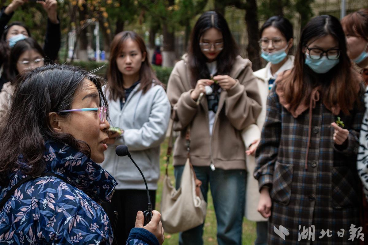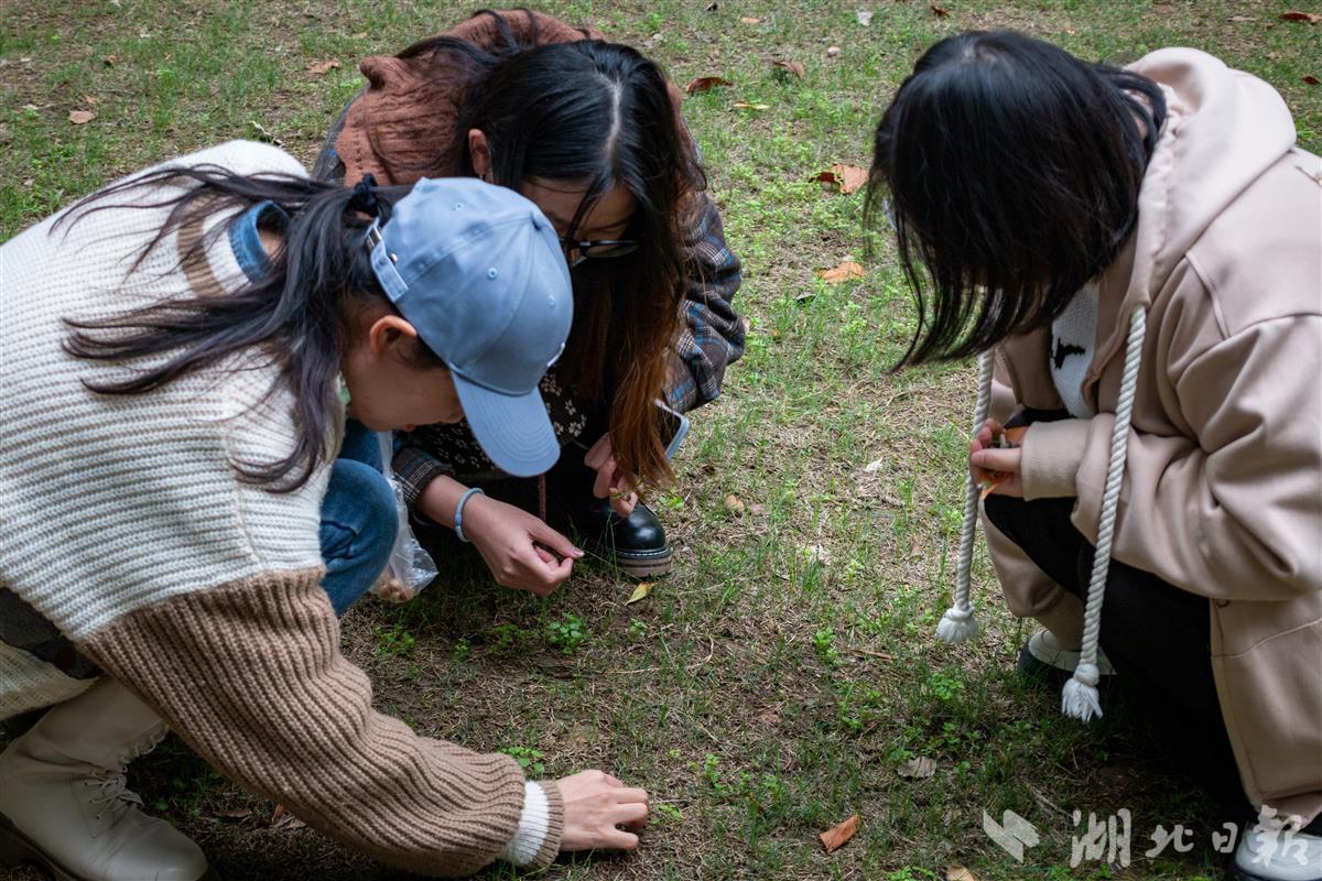 变红的叶片、像葱苗的小草、蒲公英的叶子……小树林里,庞静让学生在两片不同的草地寻找自己喜爱的植被。在湿润的土地里挖寻种子、贴近地面嗅闻花草,第一片草地让学生们发现了不少“好东西”。而播音与主持艺术专业2021级学生沈银嘉发现,“第二片草地看起来似乎贫瘠一点。”