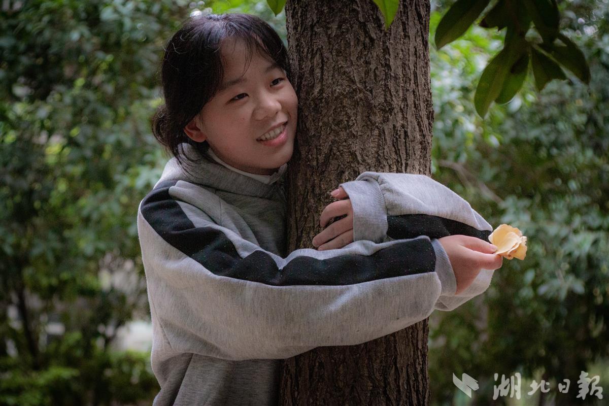 饰演银杏树之一“杏小小”的学生熊雨薇,用双手环抱树木。她说:“今天有很多伙伴陪我玩耍,我告诉风,让它带落几片叶子,表达我的开心。”