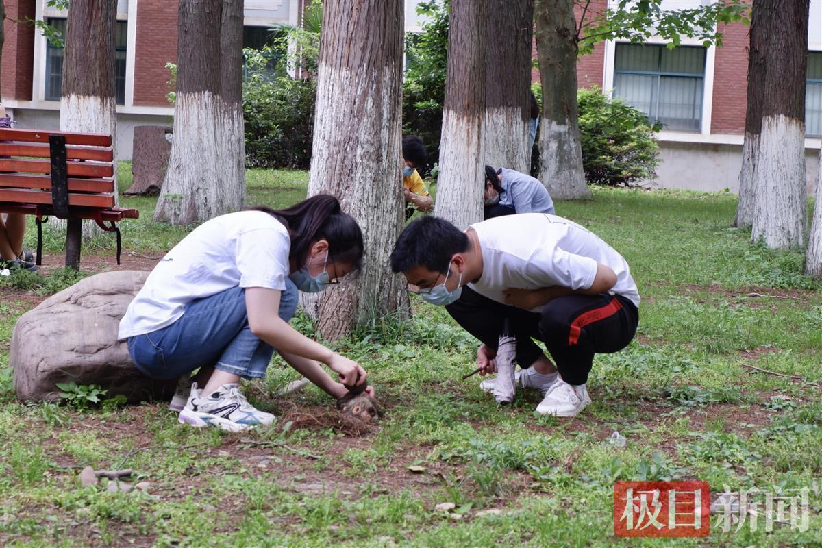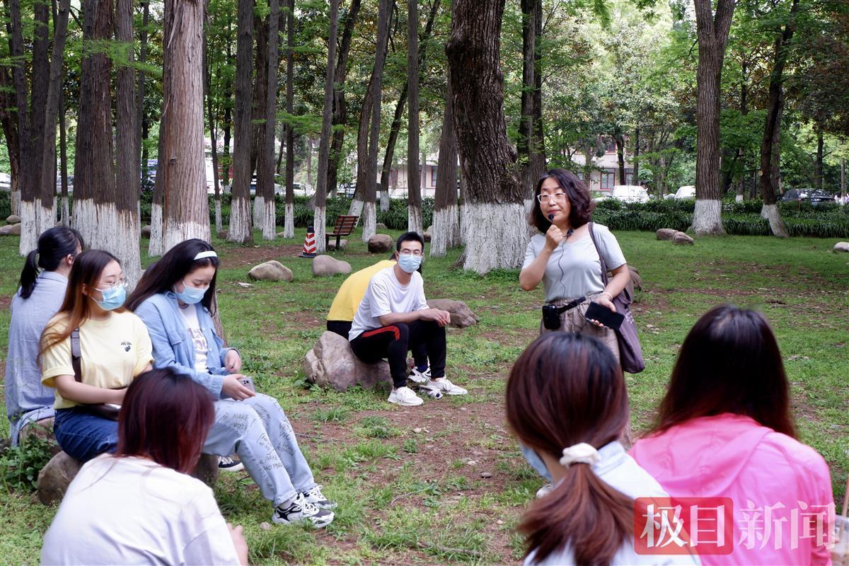 这是湖大开展的“与谁共生”生态疗愈活动。25名学生正按照指导老师庞静的引导,打开“五感”,放松身心,在校内8个自然生态景点开展自然体验和自然游戏,用图画和文字记录自然界中的花草植物,走进自然,充实自我,放松身心。