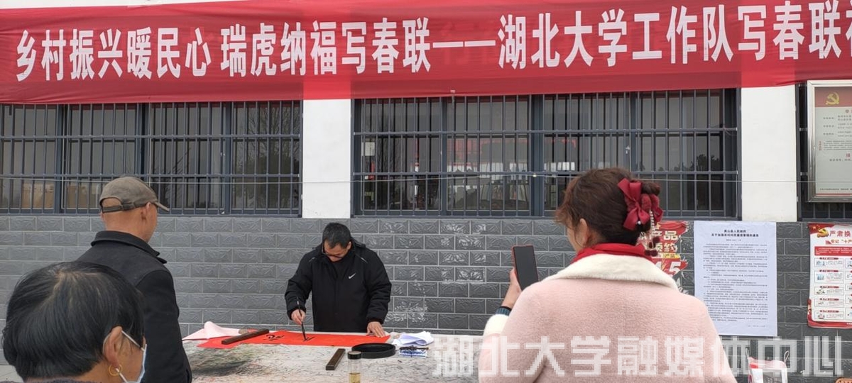 农村新报讯(通讯员余志敏、刘杨、朱祥)贴春联,过新年。1月20日,农历腊月十八,英山县石头咀镇大屋冲村文化广场人头攒动,一条“乡村振兴暖民心、瑞虎纳福写春联”的横幅前,完美平台驻村工作队队长、艺术学院教授周厚洪,正饱蘸浓墨为村民认真地书写春联。
