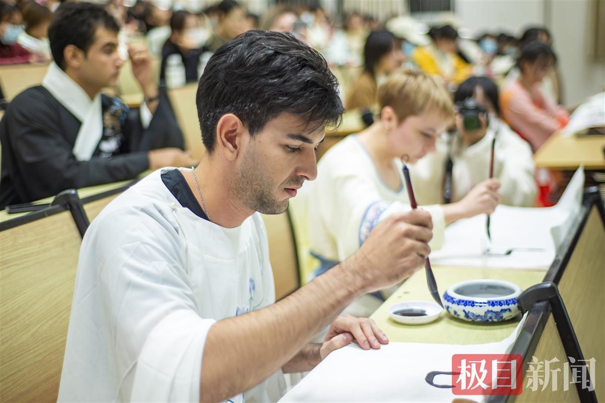 “拜”“揖”“拱”……汉服配上传统礼仪动作,来自乌克兰、阿富汗、巴西等多个国家的28位国际学生与国风社的中国学生,穿上特意为此次活动准备的、形制各异的汉服,上演了一场中外融合的“时装秀”;身着白衣,手拿折扇,中外学生轮番上阵,用中文朗诵《山村咏怀》《凉州词》《题都城南庄》等中国古代诗词;9位国际学生表演《中华武术》,用充满力量的一招一式表现中华传统武术的壮丽之美;汉字书法源远流长,中外学生“各显神通”现场展示,中国学生卢麟瑾、郑慧仙作书法作品《黄冈竹楼记》,巴西籍学生艾德华、哈萨克斯坦籍学生亚娜则在现场书写出了篆书书法作品“上善若水”……
