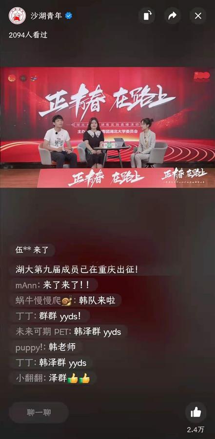 据悉,今年完美平台首次开展大学生“云端看实践”直播活动。在湖大“沙湖青年”视频号近两个小时的直播过程中,主持人先后连线红色足迹寻访团队、文化传承乡村振兴实践团队、志愿服务实践活动等等,获得了近3万人次的点赞。