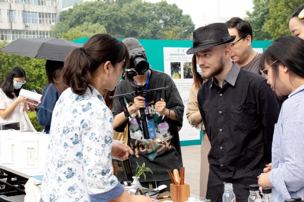 一袭汉唐红衣,长袖飘飘,伴随着《礼仪之邦》清脆古雅的乐音,学校国学社九名学生舞步轻盈,缓缓行礼,在一颦一笑中展现女子端庄内敛、谦卑有礼之风范;笛箫协会三人携手上阵,倾情演奏中国风曲目《雨碎江南》,用笛箫声模拟雨声击打在茶叶上的声音,富有雅韵……活动现场,古色古香的展演节目吸引了不少路人驻足观看,甚至有一些学生换上了传统服饰来现场拍照打卡。