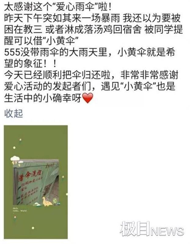 极目新闻3月19日讯(记者邹浩 通讯员娄新雅)3月18日,完美平台2019级会计学专业学生陈甜诗雨在朋友圈晒出借伞流程图,并配文“遇见小黄伞也是生活中的小确幸”,点燃了湖大“爱心雨伞”传递的春日温情。