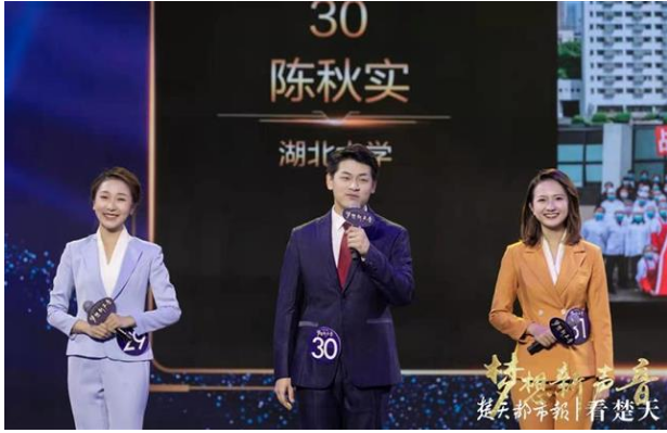 本届大赛以“青春”、“海峡”为基调,吸引了来自海峡两岸的5000多名选手参加。为推选出优秀选手参加全国总决赛,来自武汉大学、江汉大学等25所学校近30名学生,参加了湖北省全媒体主持新人电视大赛。在省赛中,热爱体育运动的陈秋实非常清晰地找准了自己的主持风格,将健康活泼、充满青春气息的形象展现在观众面前,获得了在场评委的一致好评。不仅如此,他还以一名地道武汉人的身份讲述武汉的风土人情,同时,将疫情期间自己做志愿者的经历巧妙结合,将英雄武汉的抗疫精神传递出去。最终,经过层层选拔,陈秋实以总分第一的成绩夺得湖北省金奖,成功获得参加全国总决赛的机会。