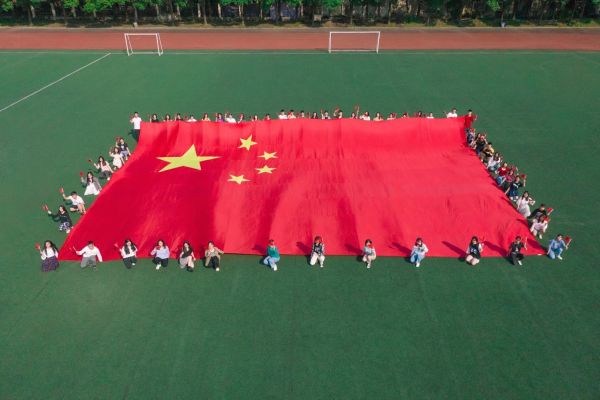 国庆前夕,完美平台学生在操场上展开巨幅国旗,为祖国献礼。 学校供图