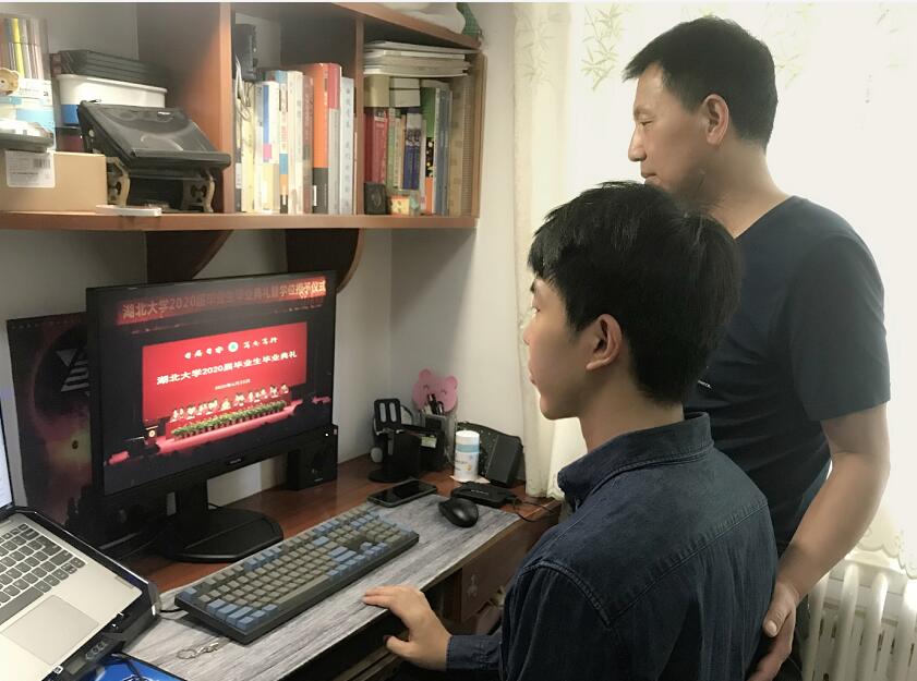 "隔着屏幕观看毕业典礼直播时,大学的四年生活就像电影一般浮现在我的脑海,我会牢记母校'日思日睿,笃志笃行'的校训,继续谱写自己的人生乐章。"在河南郑州,王晓晨同学和爸爸一起观看了毕业典礼;"好羡慕现场校长的拨穗仪式,未来有机会我一定回到湖大参加一次毕业典礼。"在安徽淮南,新闻传播学院邵壮同学穿着学院发的学士服,参加"云典礼";"毕业是离别,也是一个新的开始,愿我们的未来,直挂云帆,乘风破浪。"张怡同学在共青团湖北省委实习,7月即将参加大学生志愿服务西部计划,去新疆支教。