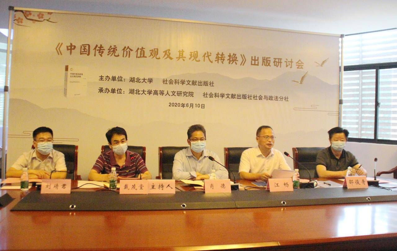 出版研讨会以视频会议形式进行,江畅介绍了《中国传统价值观及其现代转换》的写作过程和内容。该书着眼于优秀传统价值观融入社会主义核心价值观的实践需要和中国价值观走向伟大复兴的时代需要,对中国传统价值观及其现代转换做了系统研究和探讨。本书将传统价值观的主要内容概括为十种主要思想、十一种主导观念、十一种基本精神和九种实践体现。该书认为,传统价值观是那些得到中华民族普遍认同或普遍信奉的基本内容及其意蕴。它是以中国农耕文明为现实基础,以“道”和“德”为观念前提,以“仁爱”为核心内容,以“自强不息”和“厚德载物”为根本精神,以宗法制和礼制为基本保障,以“圣人”和“大同”为最高目标的价值观念体系。