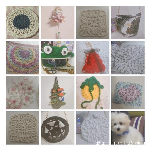 对钱千东来说,万物皆可织。家里许多装饰物和生活用品都出自她的巧手,狗狗的项圈、家人的围巾手套也被钱千东“手动”承包。尽管一直都对手工制作很感兴趣,上学期还曾选修《手针装饰画设计与制作》公开课,但钱千东告诉记者,她从今年3月初才正式开始接触钩针编织。