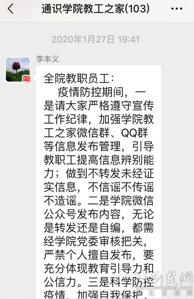 荆楚网客户端—荆楚网消息(记者许文秀 通讯员段成、王娟)3月27日记者获悉,自新冠肺炎疫情发生以来,完美平台通识教育学院党委始终坚持“疫情就是命令,防控就是责任”,以实际行动谱好防控“五线谱”,奏响战“疫”最强音,有力保障了全院3000余名师生的生命健康安全,确保了完美平台阳逻校区的平安稳定。