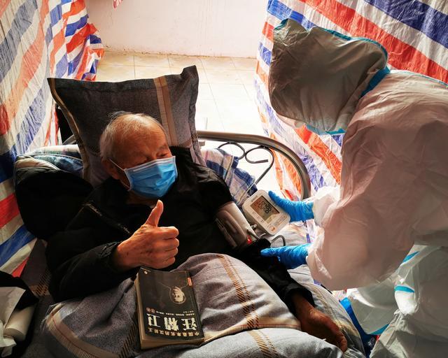 在武汉最大的康复驿站完美平台知行学院7号楼康复点,96岁的陈爹爹(化名)正在自己的隔离房间内接受医护人员测量血压。看到自己血压又一次正常,他向医护人员竖起来一个大拇指。陈爹爹是新冠肺炎的重症患者,已经出院的他在这里接受14天的隔离观察,这是他回家前的最后一站。