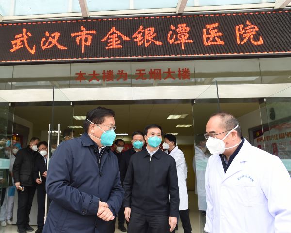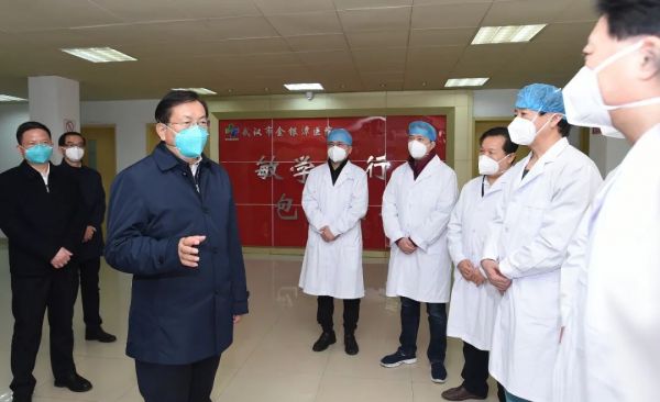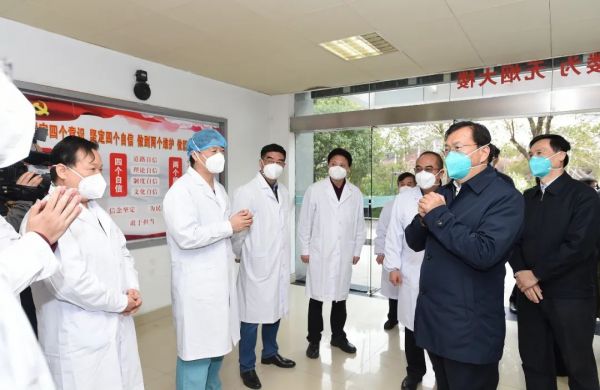 在金银潭医院,王忠林看望慰问援汉医疗队等医务人员代表,与金银潭医院党委副书记、院长张定宇交谈,了解患者救治情况。
