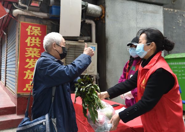 “今天有哪些品种?”新华街新育社区内,居民正有序领取购买的“10元菜”,王忠林仔细查看菜品,询问居民意见建议。
