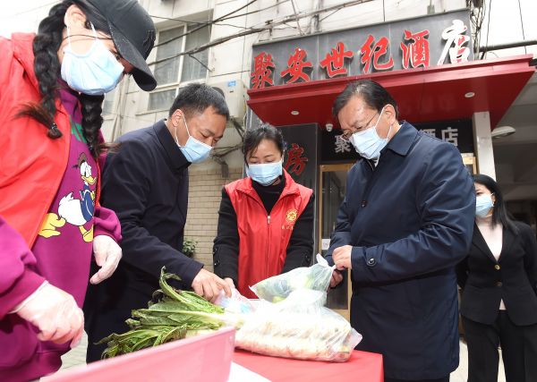 王忠林说,坚持不懈做好疫情防控工作关键靠社区,生活物资保障好了,市民们在家才能待得住。要加大“10元菜”宣传,扩大知晓度,确保菜品新鲜、品种有轮换、销售公开公正透明;多听听基层一线反馈意见,及时改进问题。临走,他感谢社区工作者的坚守与付出,叮嘱大家做好自我防护。