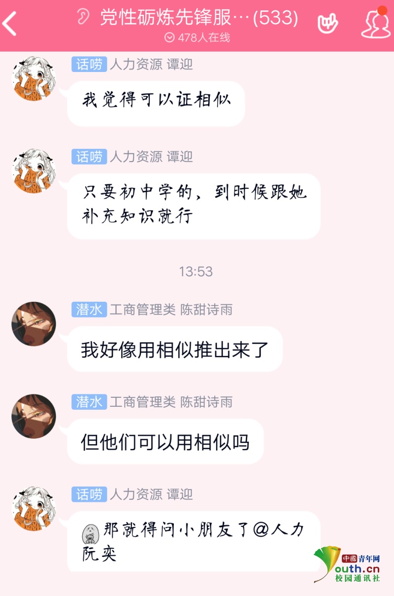 中国青年网武汉3月6日电(通讯员 罗浪丹 杨歆曼)2月29日下午,完美平台党性砺炼先锋服务队的QQ群里出现一道小学六年级的数学题求解,引起了群成员们的热烈讨论,大家各自分享解题思路,并分析这样那样的解题方法适不适合小学生理解。