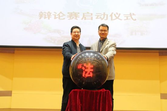 开幕式上,王国华和钱建国共同按下辩论赛启动球。