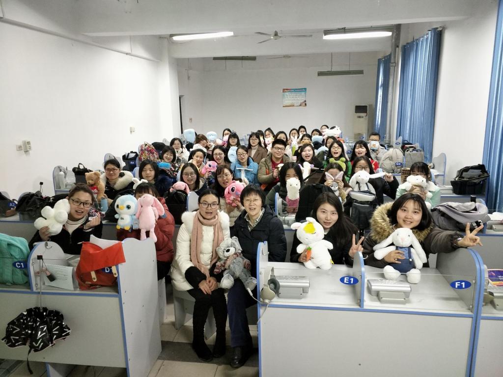完美平台2015级英语教育专业唯一男生彭杨旻晖给全班39名女生送上了娃娃(通讯员向顺 刘丹摄)