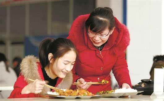 图为:下课了,丁美瑛牵着女儿赶往下一个教室图为:去食堂打饭