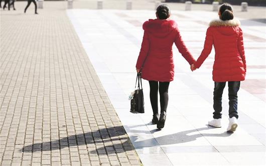 图为:丁美瑛牵着女儿走过了12年的陪读路