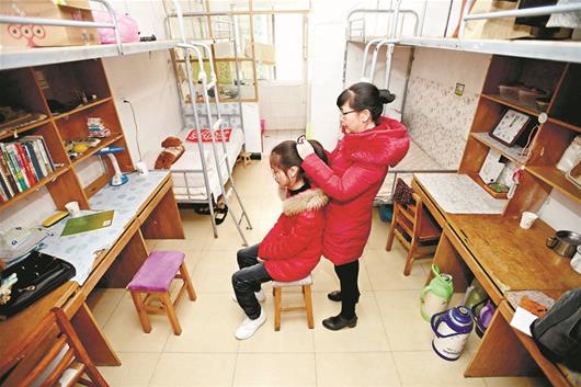 图为:在寝室里,为女儿扎辫子