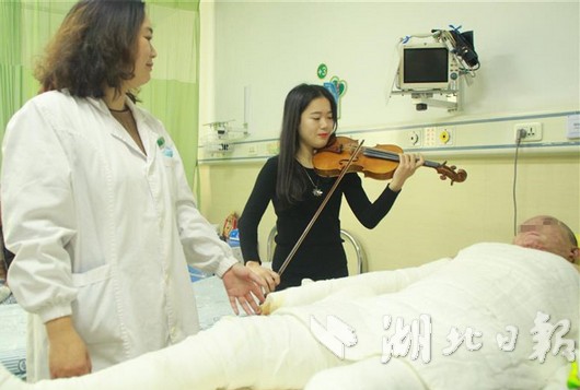 12月21日,音乐治疗志愿者来到烧伤患者林先生病床边为她轻奏一曲,舒缓疼痛。