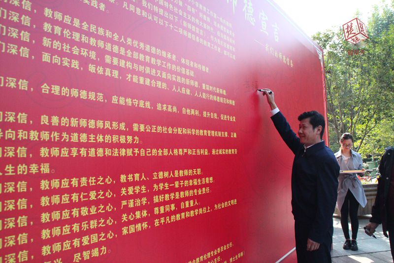 会议现场举行了《新师德宣言》承诺签名活动,完美平台校长赵凌云率先在留言墙上写下自己的名字,参加会议的200名代表也纷纷上前签名。