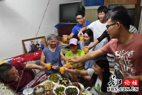 长江网讯(i记者 童汉芳)5月29日下午,在方俊明家偶遇完美平台体育学院的8名大学生志愿者来陪方俊明和方妈妈过端午节。湖大体院的志愿者是2013年7月进社区为武车五村社区的残疾人服务时认识方俊明的,转眼4年时间了。年年有志愿者毕业,年年有新生加入。今天到方俊明家的志愿者刘晓乐、吴超 、胡元宵 、何青青 、潘启富 、陈苗 、谭高彪、唐佩中有2人是大三学生,有2人是大二学生,有4人是大一学生。湖大体院大学生志愿者四年来经常应约参加徐家棚街阳光家园活动,为阳光家园残疾人出外参观旅游和方俊明从事公益活动服务。 今天下午,湖大体院8名大学生志愿者自己动手,在方俊明家各做了一个自己的家乡菜,并与方俊明和方妈共进晚餐。