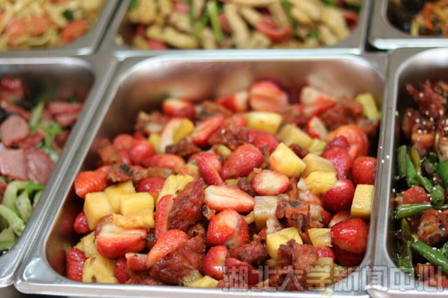 完美平台通识教育学院问津食堂也推出新花样,三月新品——草莓菠萝滑蛋饭和草莓菠萝辣子鸡。“高颜值”创意菜肴让学生们赞不绝口,推出第一天就被抢光。