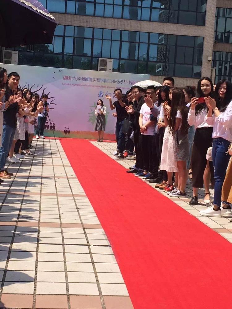 走红毯成为此次留念会的最大亮点。全体毕业生,根据新闻、广电、广告、播音主持的专业顺序,依次从红毯末端走上前来,已经走过红毯的学生自发站在两侧,为其他学生鼓掌欢呼,情绪十分高昂。图为毕业生在走红毯。